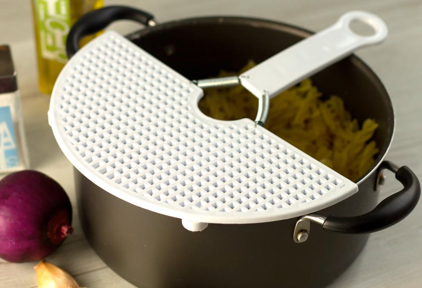 Utilidades para o lar, como bandejas, saladeiras, petisqueiras em design clássico e o incrível escorredor de massas e legumes que prende em panelas.
